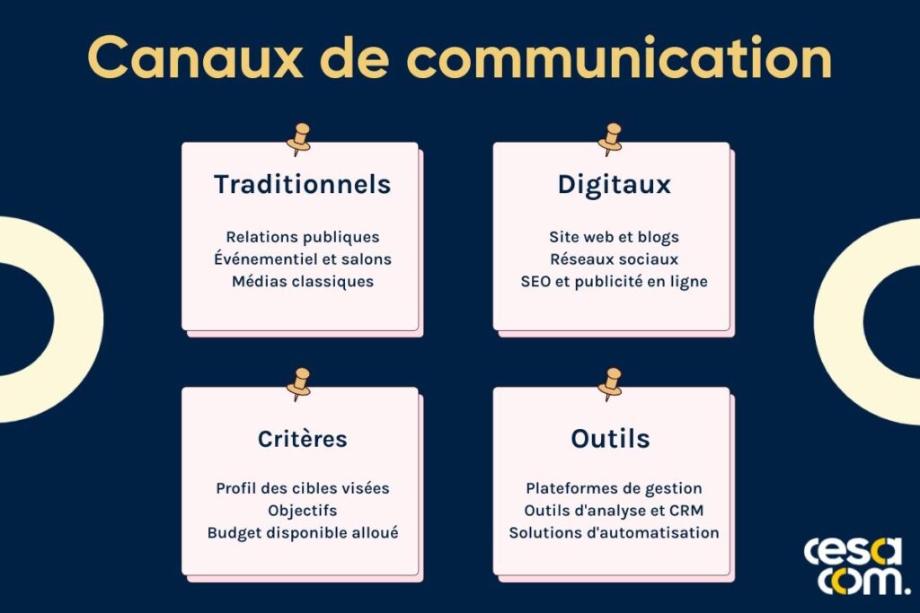 Les canaux traditionnels regroupent la presse, l’événementiel, l’affichage, la radio et la télévision. Les canaux digitaux s’articulent autour du site web, des réseaux sociaux, de l’emailing, de l’influence et du référencement (SEA/SEO).