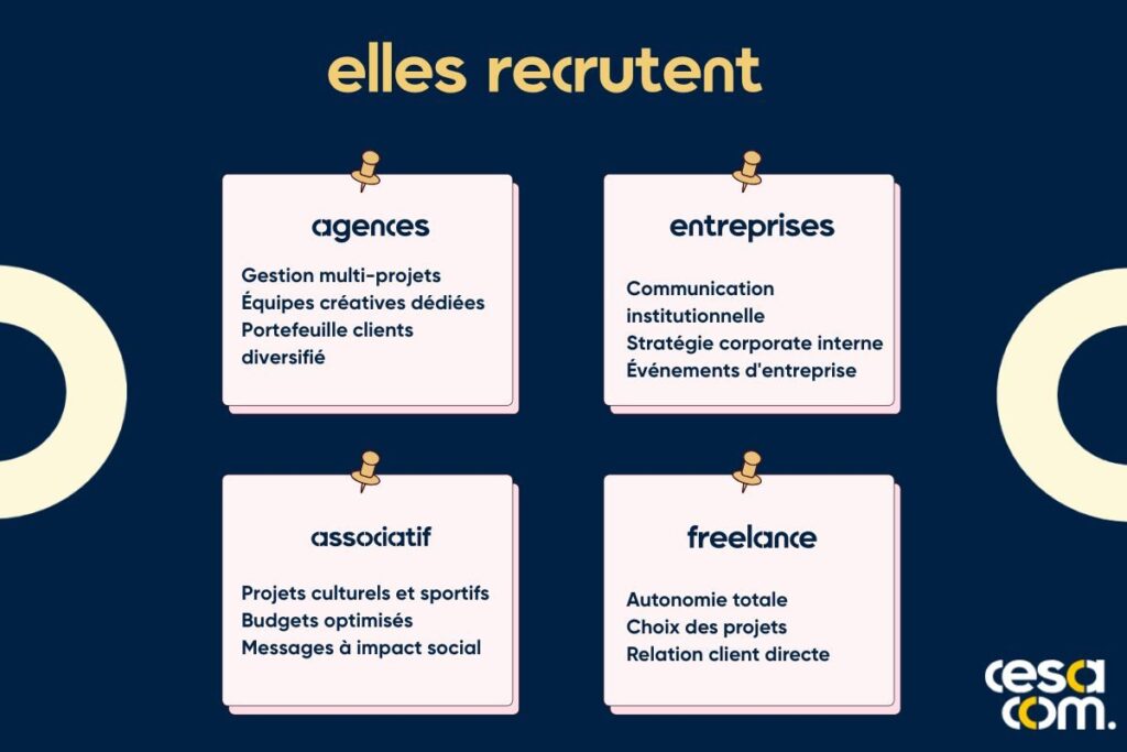 La majorité des postes de concepteurs rédacteurs se concentrent en agence de communication, publicité ou marketing. Vous y évoluez au sein d’équipes créatives dynamiques, mais d’autres options existent :