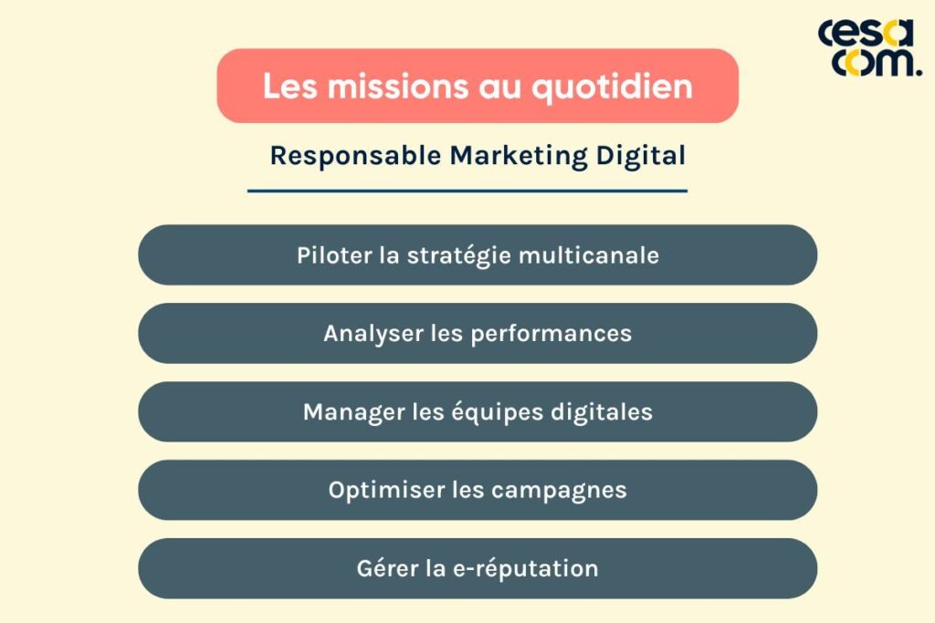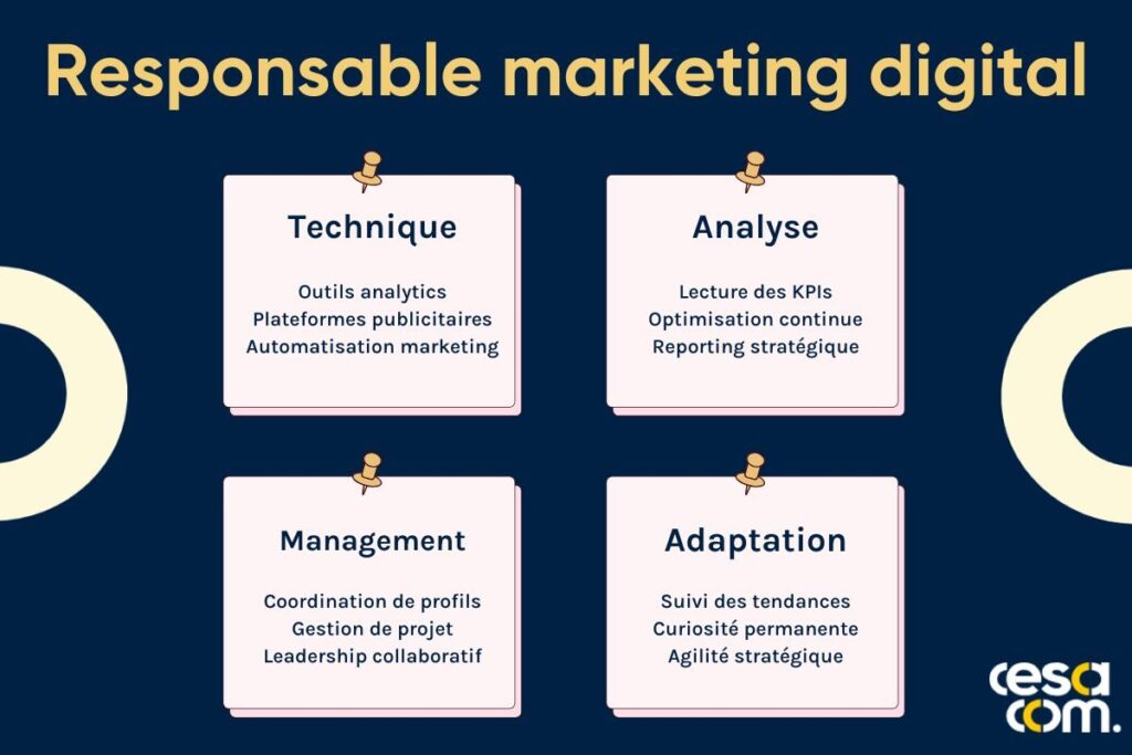 Le responsable marketing digital, quant à lui, se concentre exclusivement sur les leviers numériques : SEO, SEA, réseaux sociaux, emailing, affiliation.